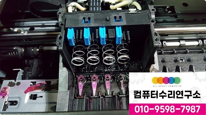 프린터 내부에는 누수된 잉크가 번져 헤드 부분까지 오염된 상태였습니다.